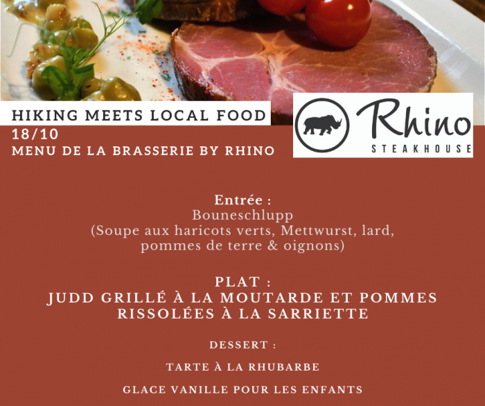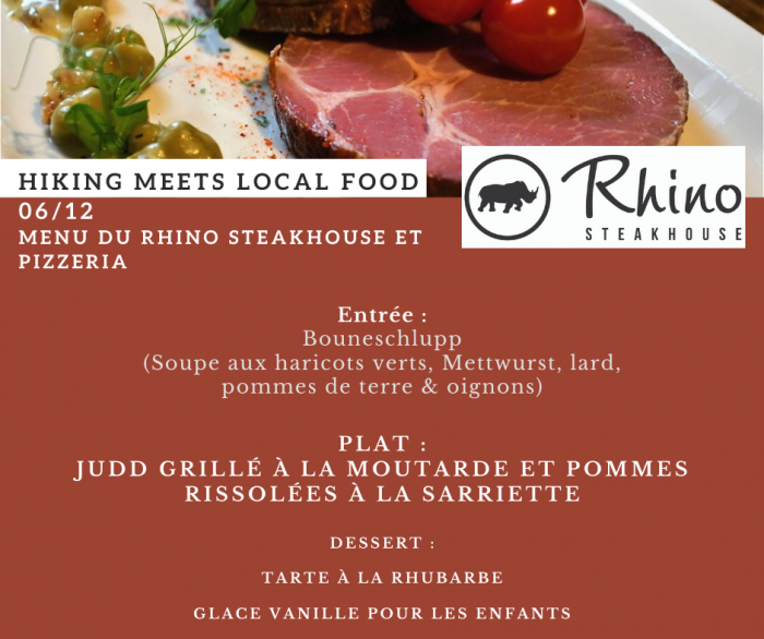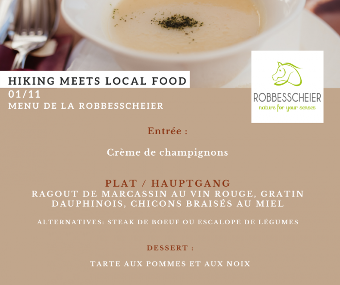 Nach der Wanderung werden Sie zu einem 3-Gänge-Menü eingeladen, bei dem regionale Rezepte und Produkte im Mittelpunkt stehen. Die Essenszeit beträgt ungefähr 1,5 Stunden. Bitte beachten Sie, dass die Getränke während des Essens auf Ihre Kosten gehen.