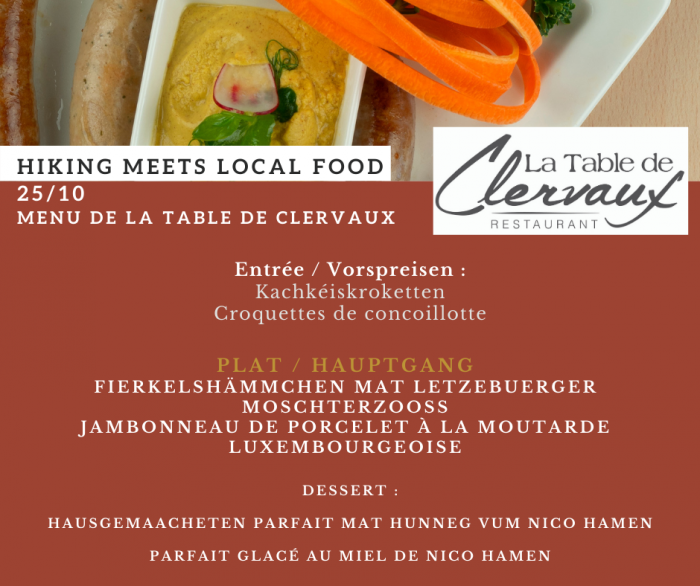Das Wandern mit der Entdeckung der lokalen Gastronomie zu verbinden, ist möglich! Seit 2019 organisiert das Tourist Center Clervaux seine Gourmet-Wanderungen für ausländische und lokale Besucher. Das Prinzip ist ganz einfach: In Begleitung eines Naturführers wandern Sie vormittags auf den lokalen Wanderwegen und genießen am Nachmittag ein 3-Gänge-Menü in einem der teilnehmenden Restaurants. Ausländische Reisende haben so die Möglichkeit, eine umfassende Erfahrung zu machen und in die Natur, Kultur und Gastronomie der Region einzutauchen. Für die Einheimischen ist es ein soziales und kulinarisches Treffen, eine Gelegenheit, Wanderer zu treffen und neue Adressen zu entdecken.