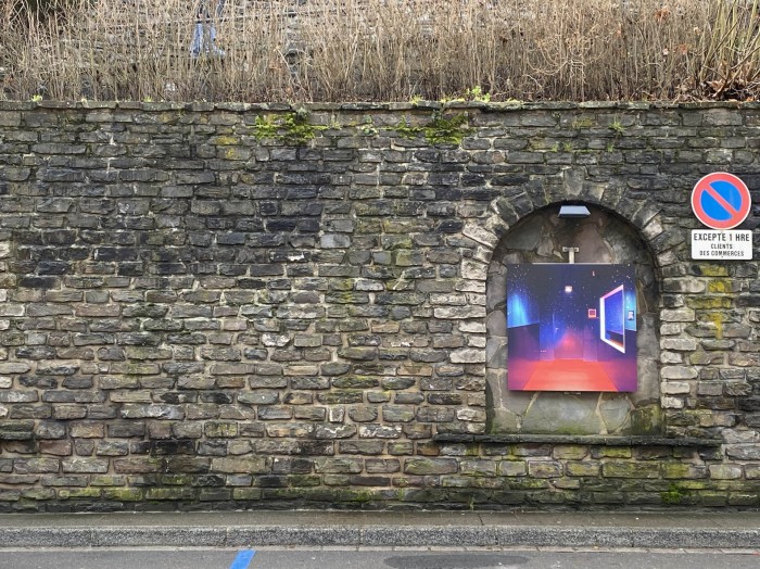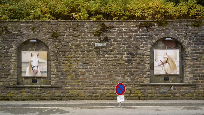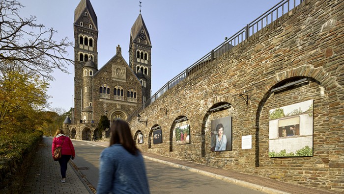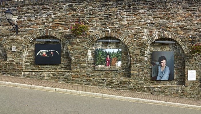 A wall at the edge of the main street (Grand-Rue) of Clerf is interrupted by eight niches in the form of round arches. Each niche contains a work of art. The exhibited images are also illuminated at night. The place is characterised by its homogeneous rhythm: the niches interrupt the wall at regular intervals. The photographs seem to pierce through the compact stones in the wall and turn the simple niches into virtual windows.