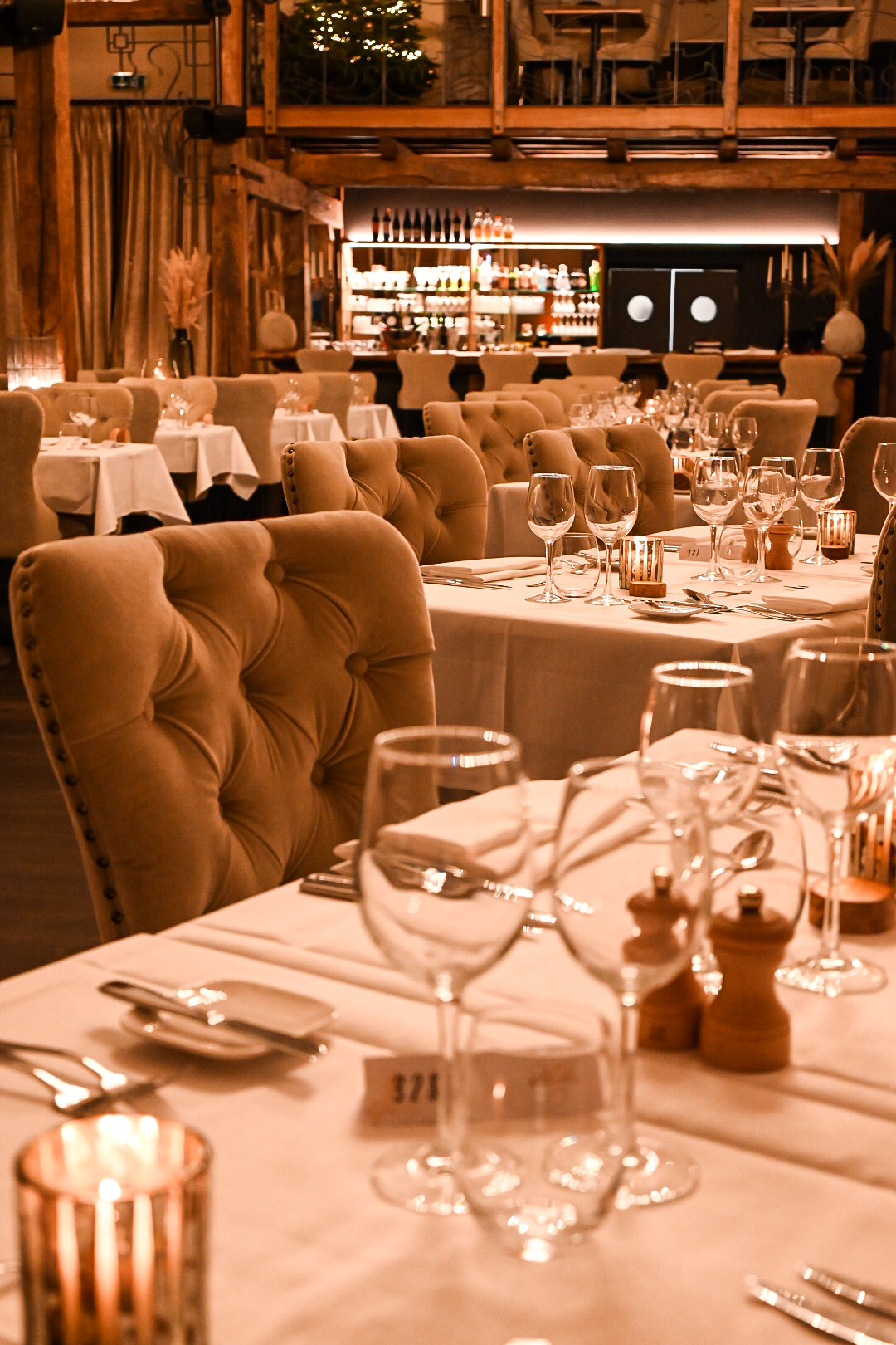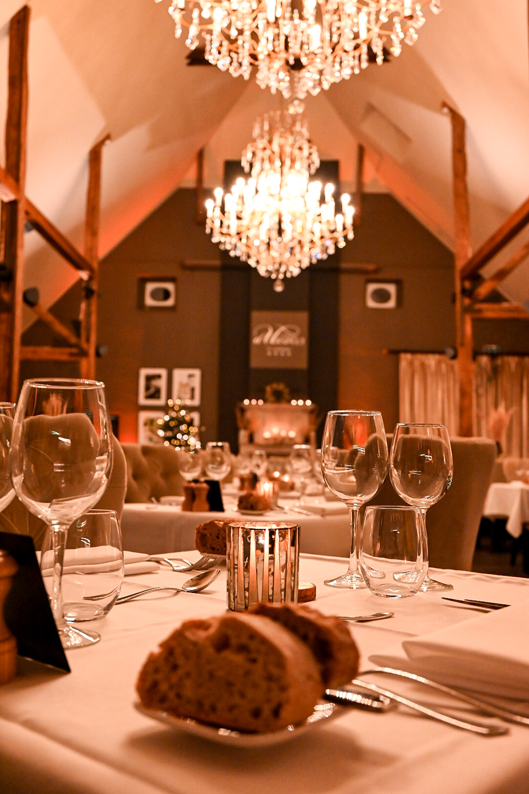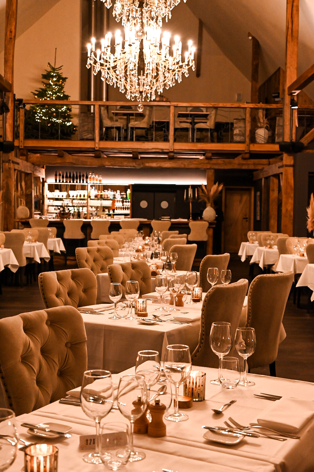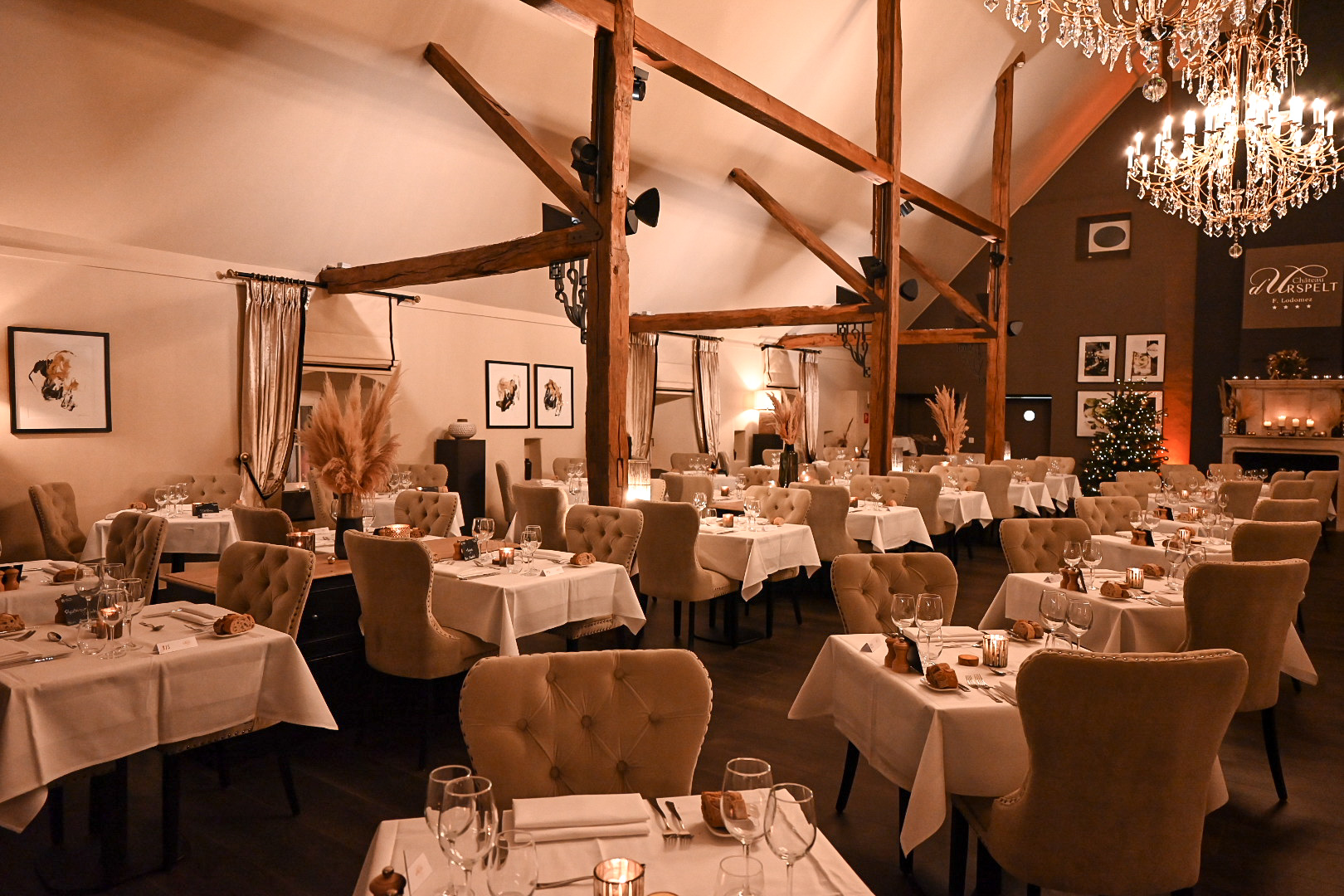 Restaurant élégant au Château d’Urspelt avec cuisine raffinée et terrasse dans la cour historique. Partie intégrante de l’hôtel.