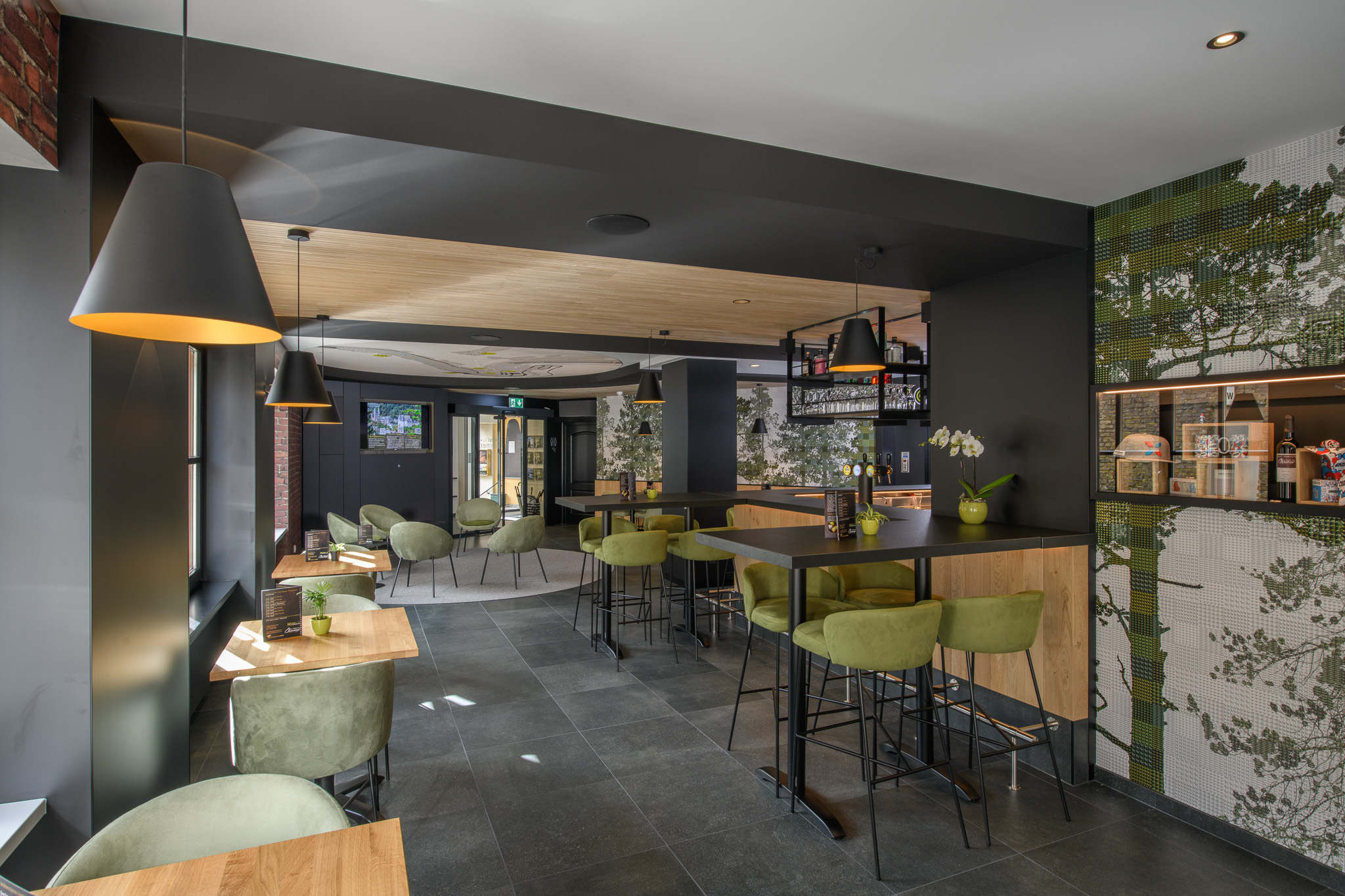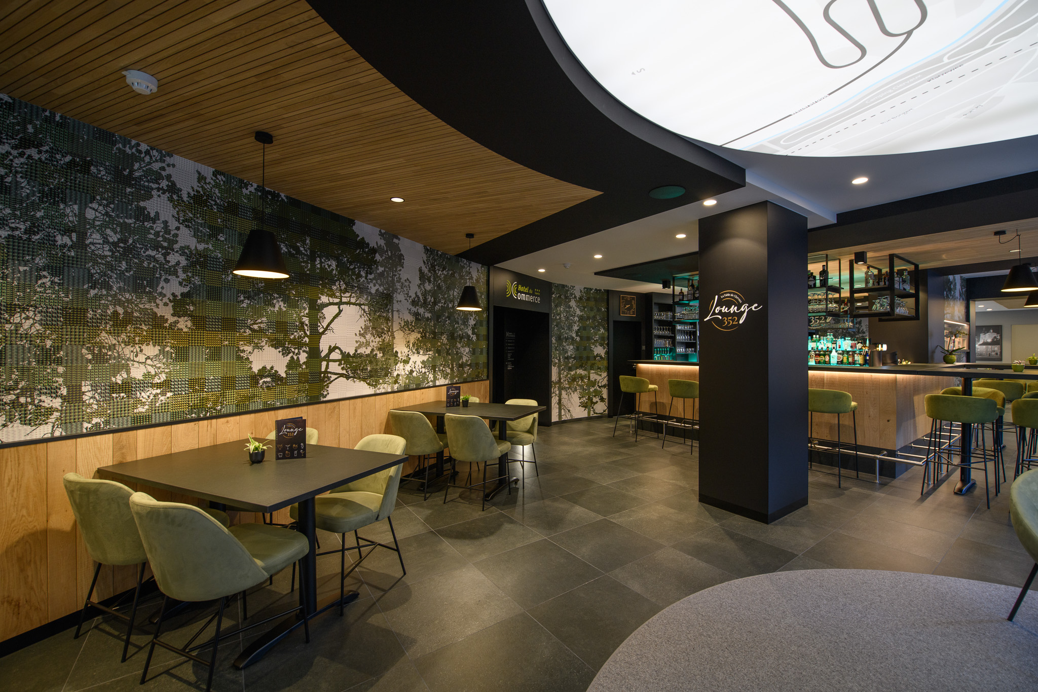 Lounge 352 in Hotel du Commerce in Clervaux is een stijlvolle ontmoetingsplek voor gasten en bezoekers. Het interieur bestaat uit warme kleuren, natuurlijke materialen en een elegante bar met invloeden uit de natuur van de Éislek. Bosmotieven en stoffen in natuurtinten zorgen voor een harmonieus en uitnodigend geheel. Ideaal om voor of na het eten te genieten van een aperitief of cocktail.